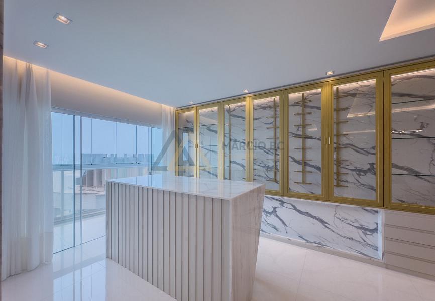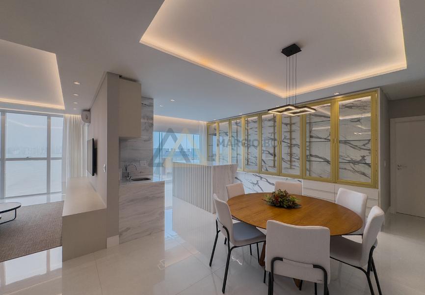 Apartamento no Edifício Italian Residence na Barra Norte de Balneário Camboriú, mobiliado, decorado e equipado, com vista panorâmica para o mar. Possui 191,35 m², 4 suítes, sala de jantar integrada, espaço gourmet com churrasqueira à carvão, living com 3 ambientes, sala de estar, copa cozinha, lavabo, área e banheiro de serviço, e 2 vagas.