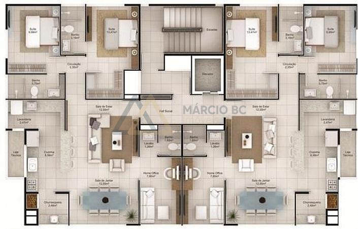 São 2 apartamentos por andar com 2 suítes + home office