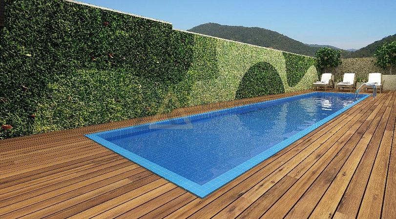 - Entrada e áreas externas da piscina com plantas verdes